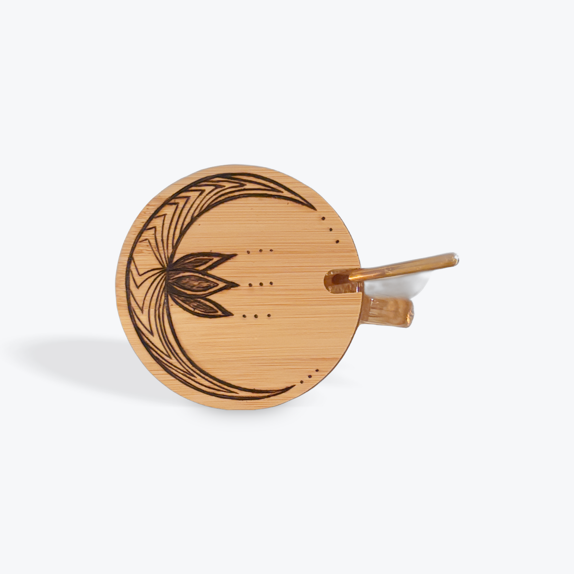 Includes: 1 mug, 1 wooden hand-burned lid, 1 gold-plated spoon