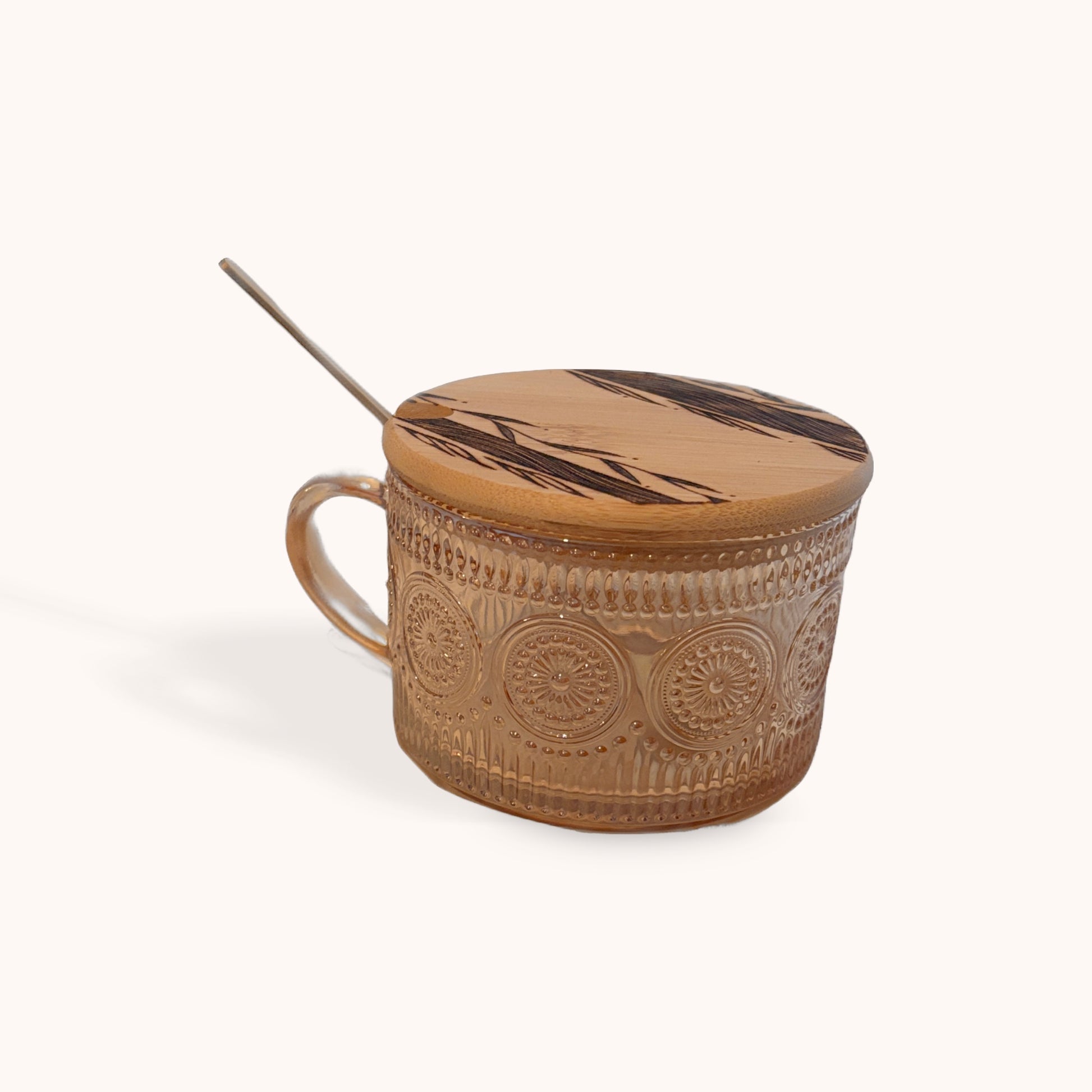 These 14oz amber-hued vintage-style mugs are made from premium embossed glass. Durable, sturdy, and beautifully textured for everyday use. Each mug includes a hand-burned bamboo wooden lid and a gold-plated spoon, adding a warm, artisanal touch to your daily coffee or tea ritual.
