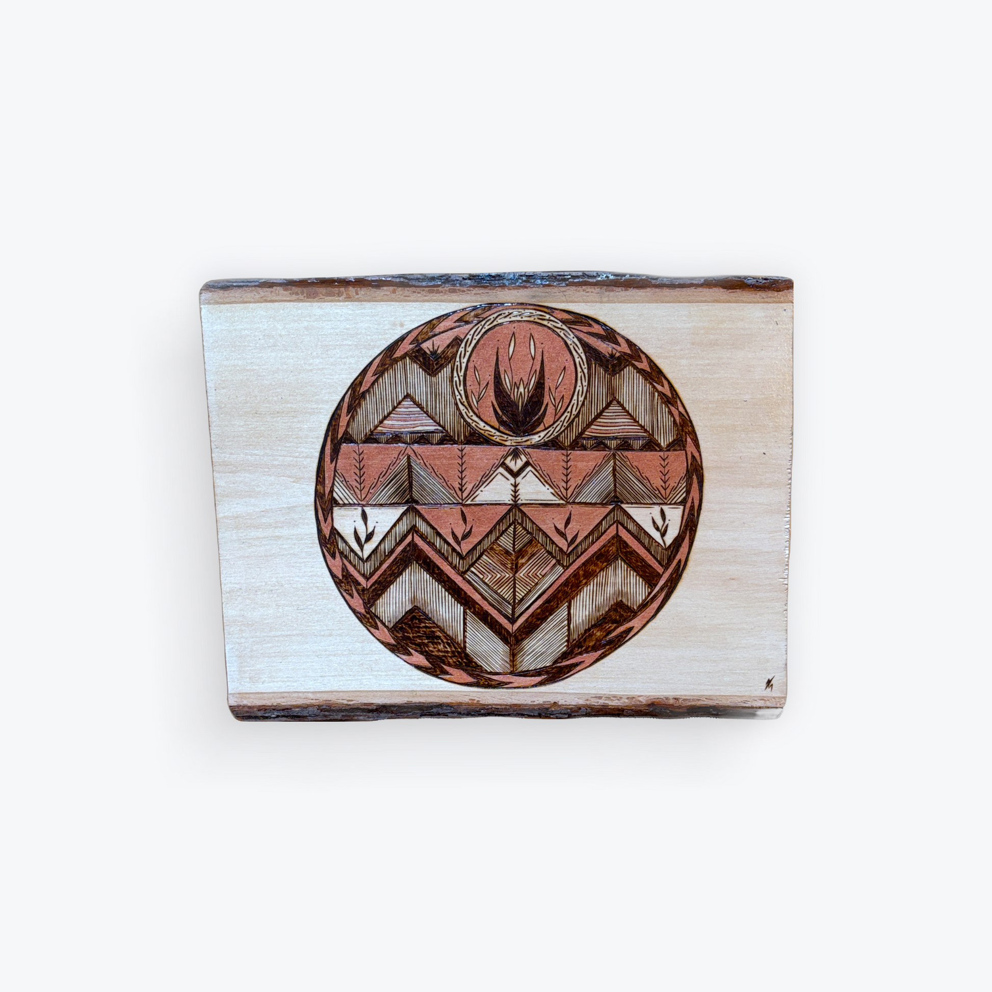 Burned by hand into basswood, this piece centres pattern as something living and connected. Quillwork-inspired geometry, vines, and fern forms move across the surface, creating a rhythm that feels both grounded and growing. Subtle rose gold accents and the circular centre medallion catch the light like the first warmth of sunrise.